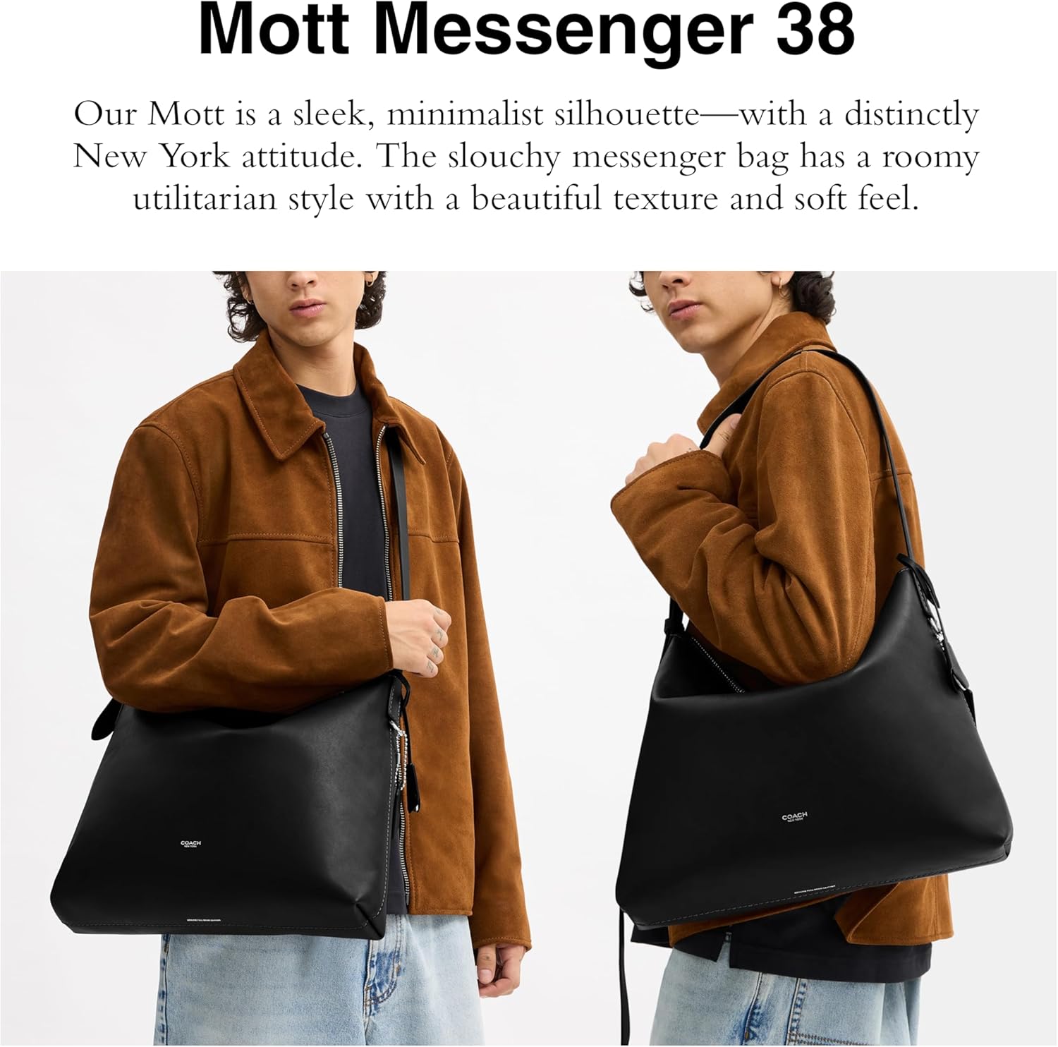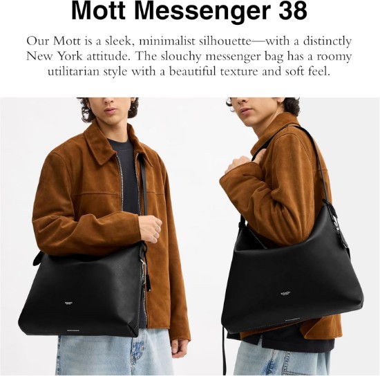 Our Mott is a sleek, minimalist silhouette—with a distinctly New York attitude. The slouchy messenger bag has a roomy utilitarian style with a beautiful texture and soft feel. Natural grain leather and vegetable-tanned leather. Inside snap pocket and zip-top closure. Adjustable strap with 18' drop. 15' (L) x 12' (H) x 3 1/2' (W)