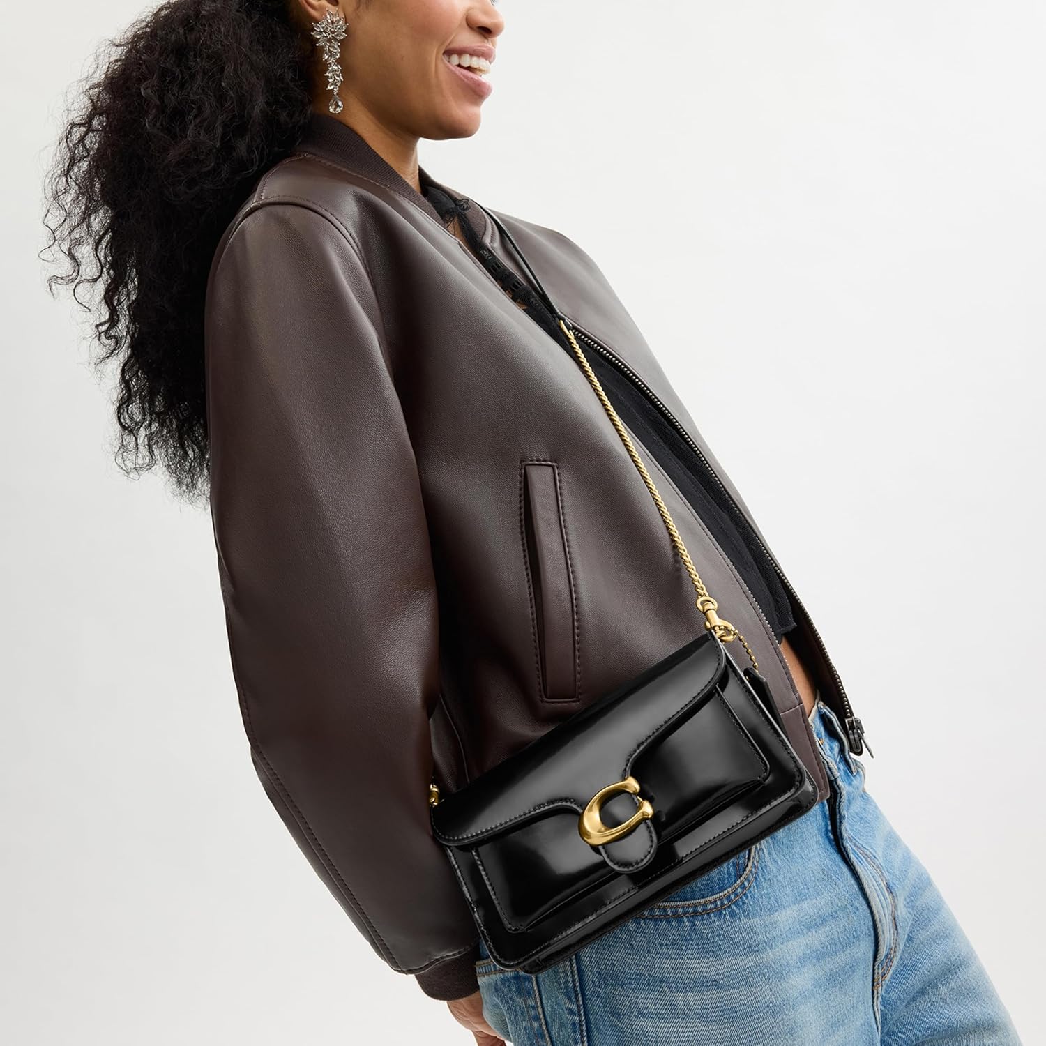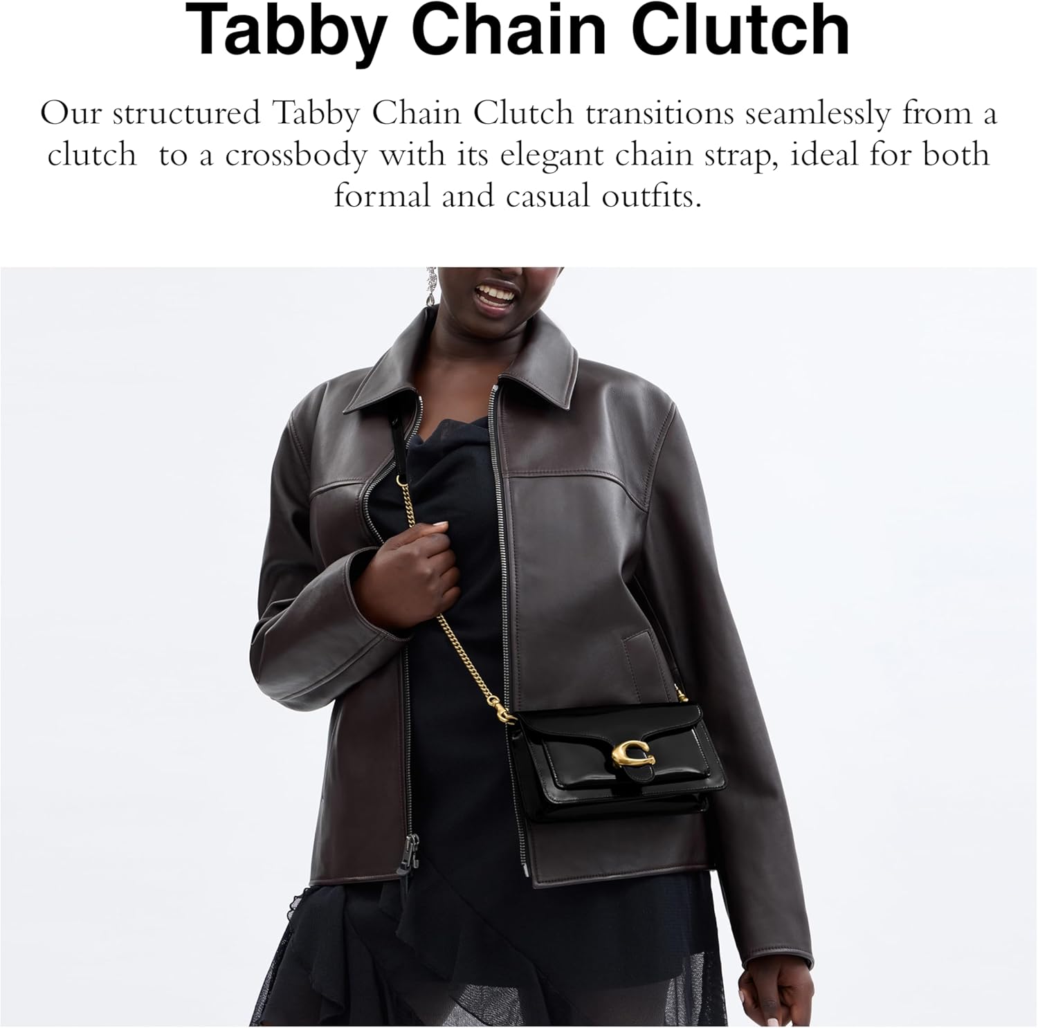 A modern take on an archival 1970s Coach design, our structured Tabby clutch is crafted of polished pebble leather. Finished with our Signature hardware, this organized, three compartment design has a secure interior zippered compartment and an exterior slip pocket for easy access to essentials. The versatile bag can be carried as a clutch or worn crossbody with the elegant chain strap, making it the perfect choice for both dressed up and casual looks.