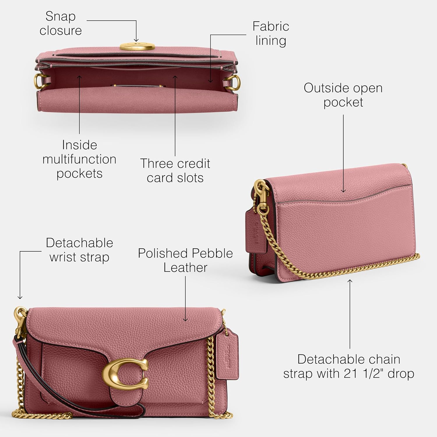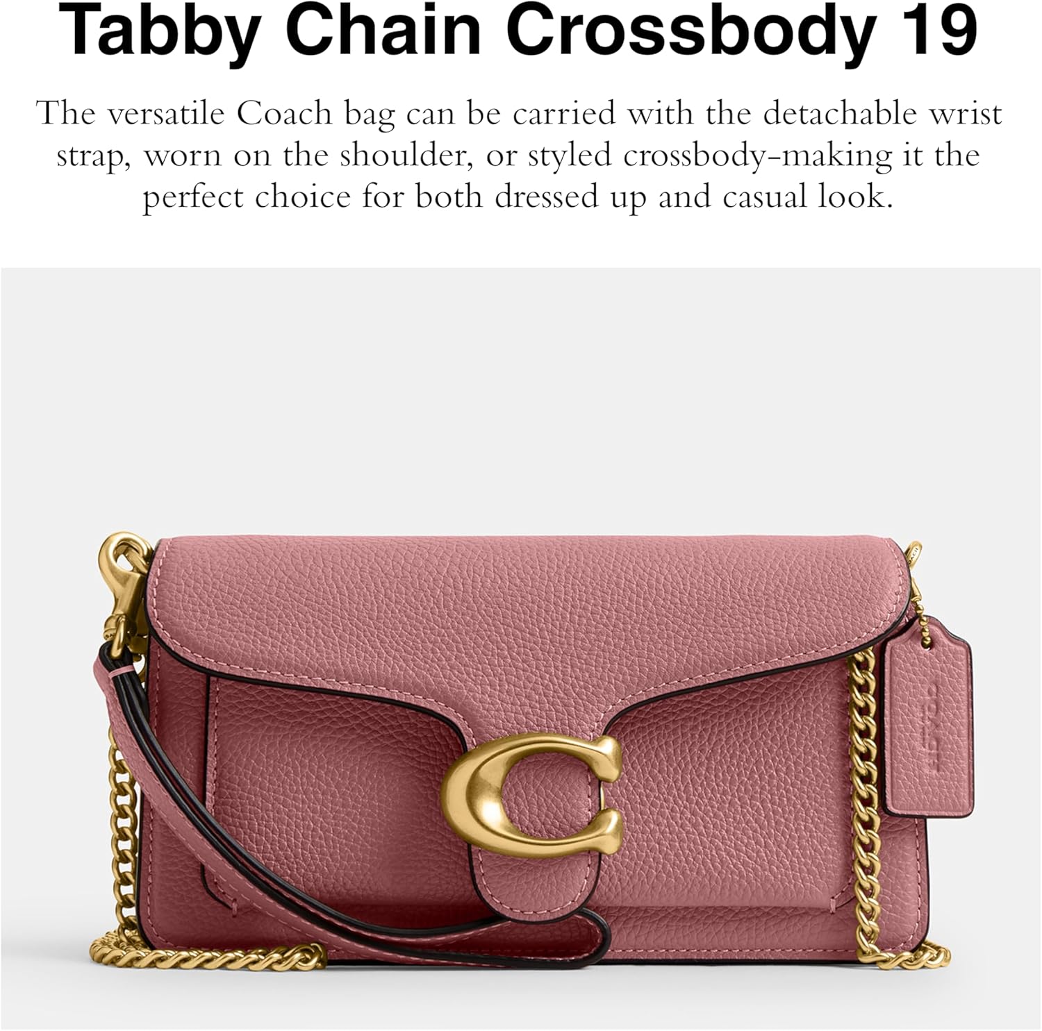 The COACH Tabby Chain Crossbody Bag 19 With Quilting is the perfect addition to your outfits. Crafted with quilted Nappa leather, the crossbody bag features a snap closure, two internal credit card slots, an internal multifunction pocket, an external open pocket, and a detachable wrist strap & crossbody chain strap. The metal hardware detail at the front adds an exquisite touch. Leather lining.