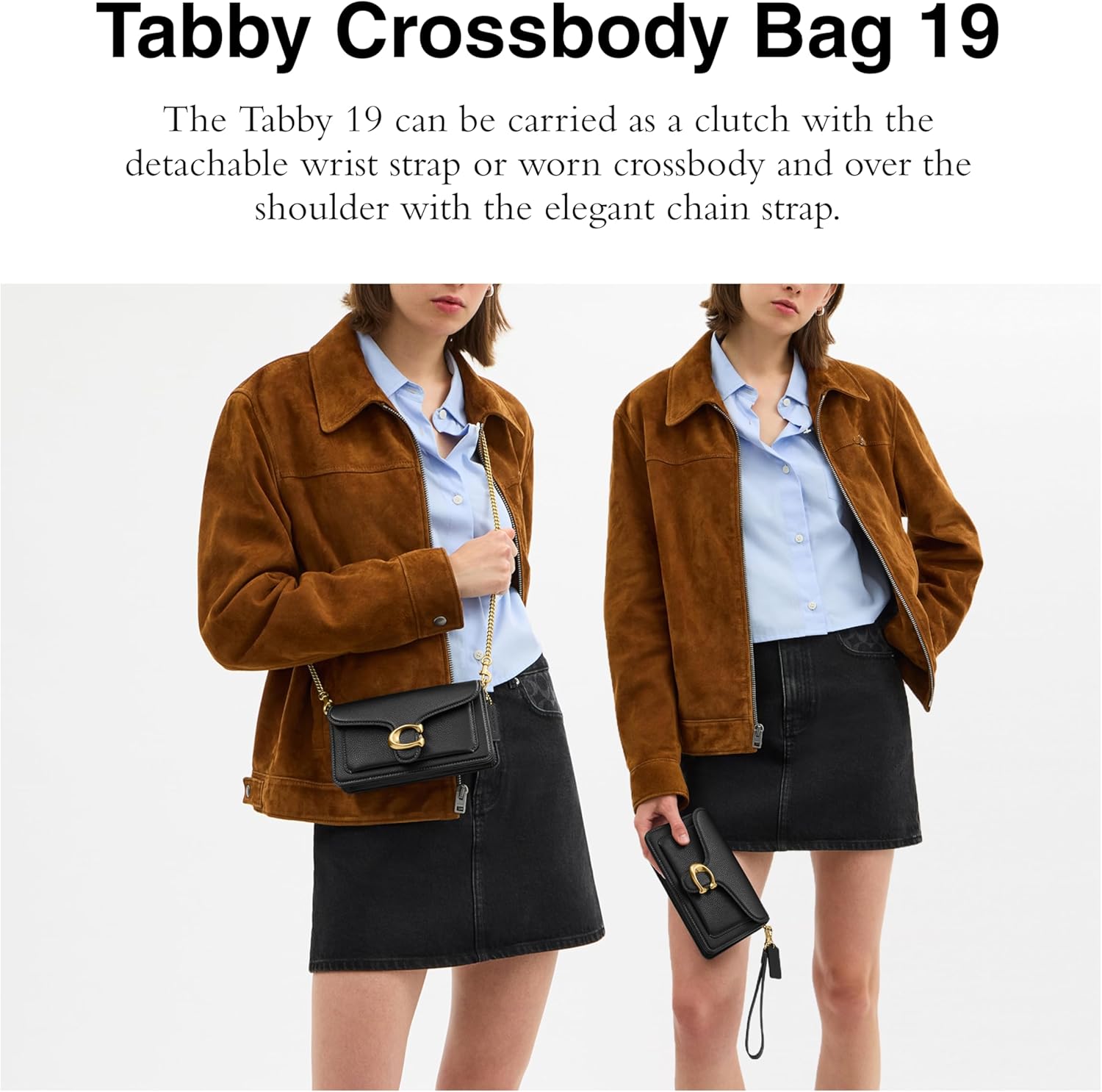A modern take on an archival 1970s Coach design, our structured Tabby clutch is crafted of Plosihed Pebbled Leather. Finished with our Signature hardware, it features outside pocket, inside multifuntion pockets with 3 credit card slots and detachable long strap with 21 1/2' drop for shoulder or crossbody wear, 7 3/4' (L) x 4 1/4' (H) x 1 3/4' (W)