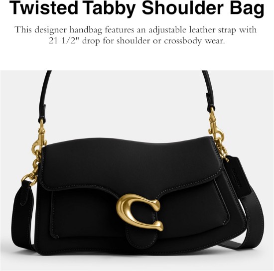 This statement Twisted Tabby Shoulder Bag from COACH turns heads with its luxurious glovetanned leather and edgy twist-loc. Designed for the fashion-forward and functionality-minded, it features zippered and multifunction pockets inside to keep your essentials in perfect order. A snap closure and smooth fabric lining ensure everything stays secure and stylish. Rock it your way with the detachable handle or go hands-free using the adjustable strap-hello, crossbody perfection! The outside open pocket offers quick-access convenience without sacrificing sleek design.