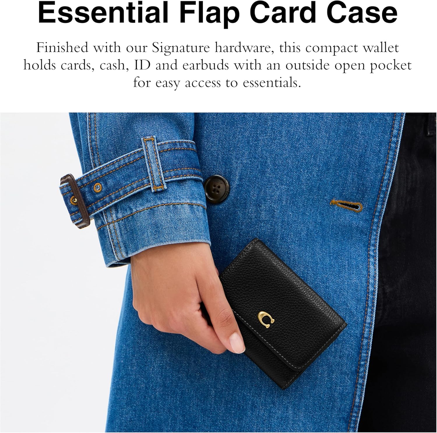Our Essential Flap Card Case wallet is crafted of refined calf leather and features 4 credit card slots, an outside open pocket a snap closure. Finished with our Signature hardware, this compact womens wallet holds cards, cash, ID and earbuds with an outside open pocket for easy access to essentials.