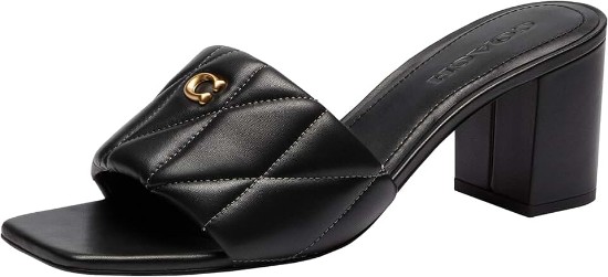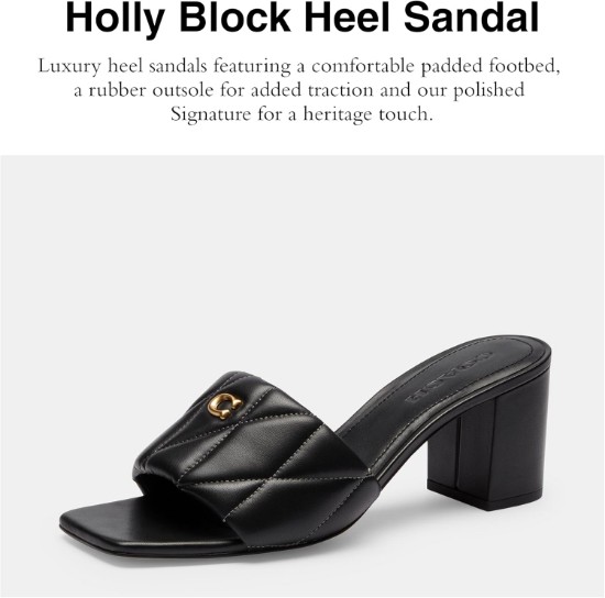 Strut in confidence wearing the COACH Holly Block Heel Sandals with Quilting. Crafted from leather upper, man-made leather lining, and leather insole, this pair of sandals features open square toe, quilted wide strap on the vamp with gold-tone logo emblem, slip-on style, block heel, and brand detailing on the footbed. Leather outsole.