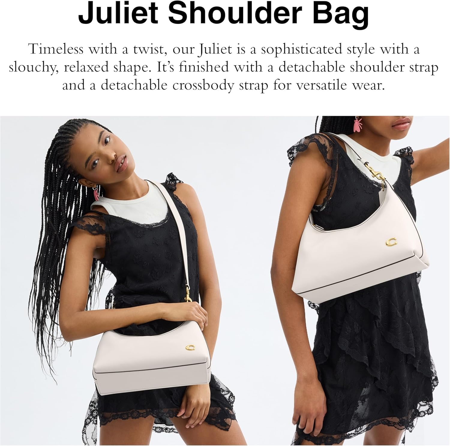 Put the fun in fashion with the COACH Juliet Shoulder Bag. Crafted from leather, thi sbag features zippered closure, detachable carry handle, detachable crossbody strap and brand hardware logo on the front. It comes with one interior snap pocket. Cotton lining.