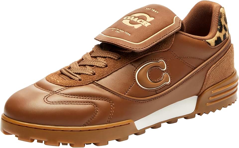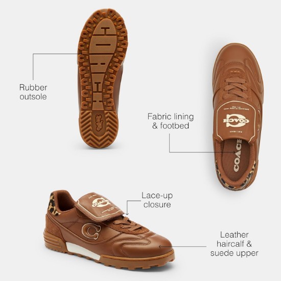 Inspired by vintage cleats, this sporty fashion sneaker set upon a nubby rubber sole is detailed with monogrammed side paneling and a branded tongue overlay. Crafted with a silky, leopard-patterned haircalf, velvety suede and smooth leather upper, fabric lining and footbed, rubber outsole & lace-up closure