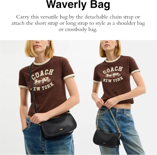Effortlessly sophisticated, the Waverly Bag is crafted of natural grain leather and perfect for happy hours, date nights, and weekends. Natural grain leather, inside snap pocket, zip-top closure, fabric lining, detachable chain strap with 10 3/4' drop, detachable short strap with 10 3/4' drop, detachable long strap with 21 1/2' drop for shoulder or crossbody wear, 9 1/2' (L) x 5 1/2' (H) x 3 1/4' (W)