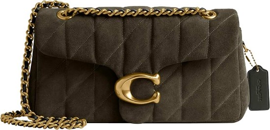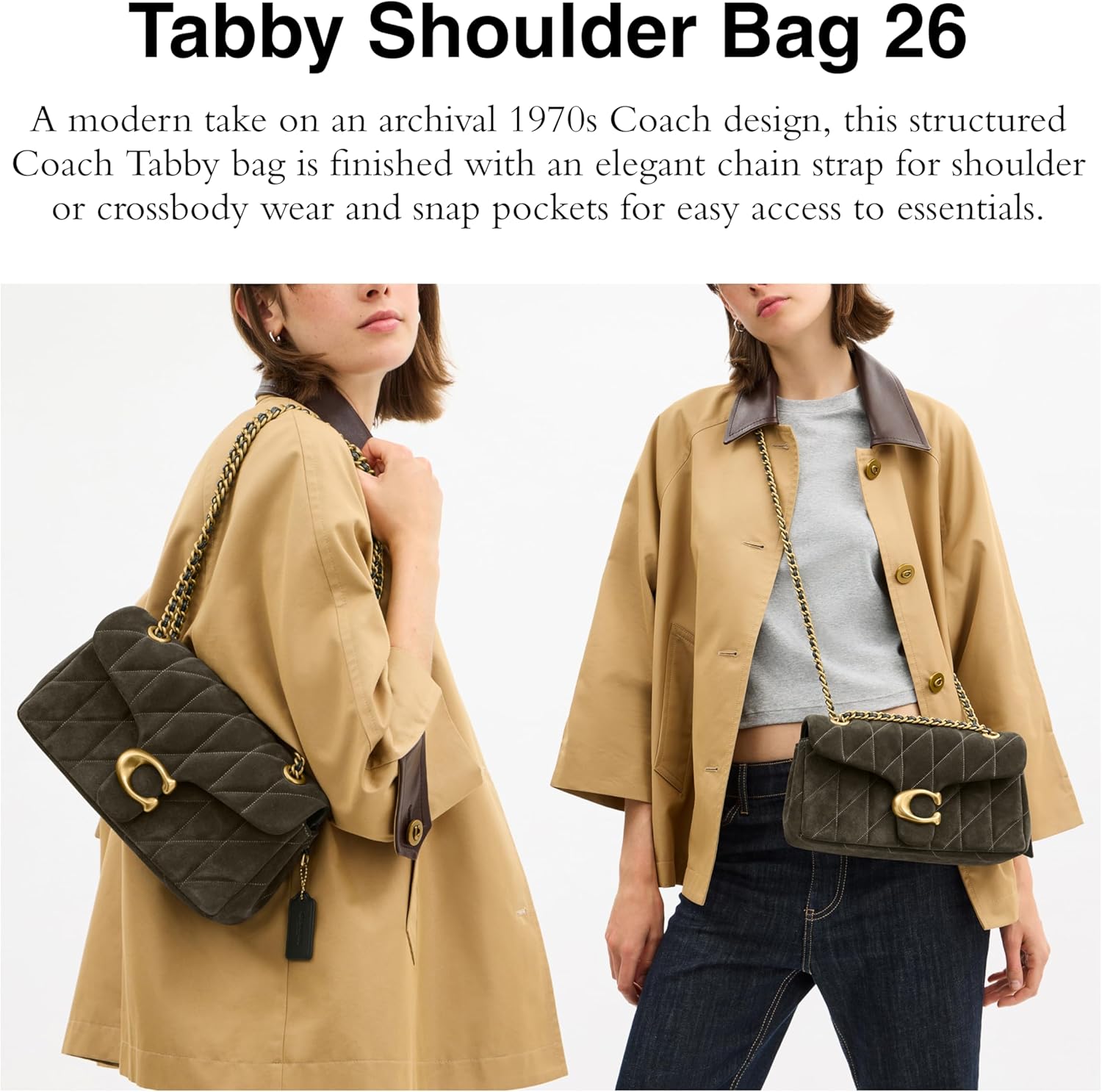 A modern take on an archival 1970s Coach design, our structured Tabby shoulder bag is crafted of natural grain leather and finished with our Signature brass hardware for an iconic touch. This roomy bag features a leather lining, outside zip pocket, detachable short strap with 9 1/2' drop and detachable long strap with 21 1/2' drop for shoulder or crossbody wear. 10' (L) x 5 1/2' (H) x 2 3/4' (W)