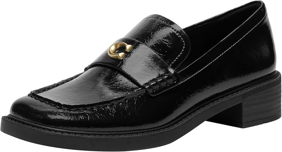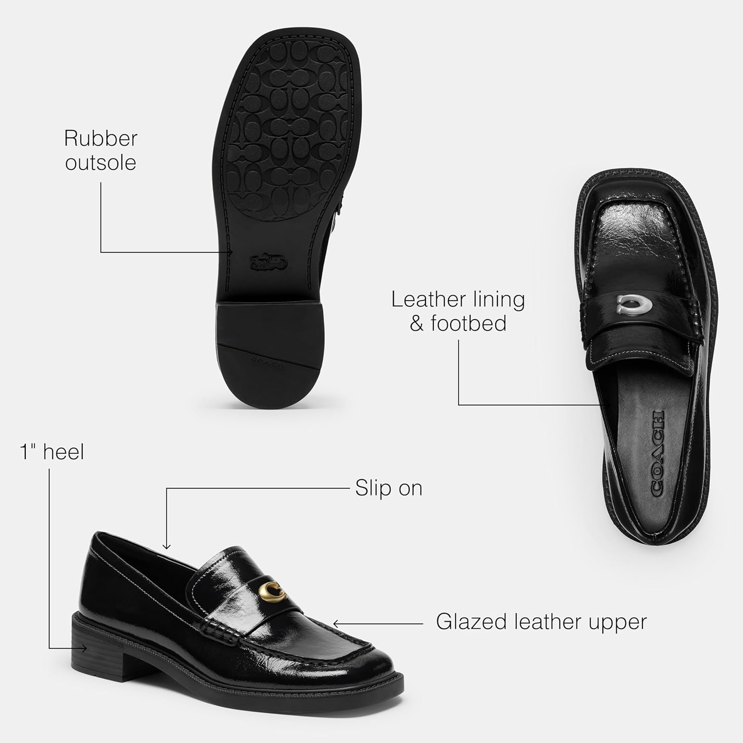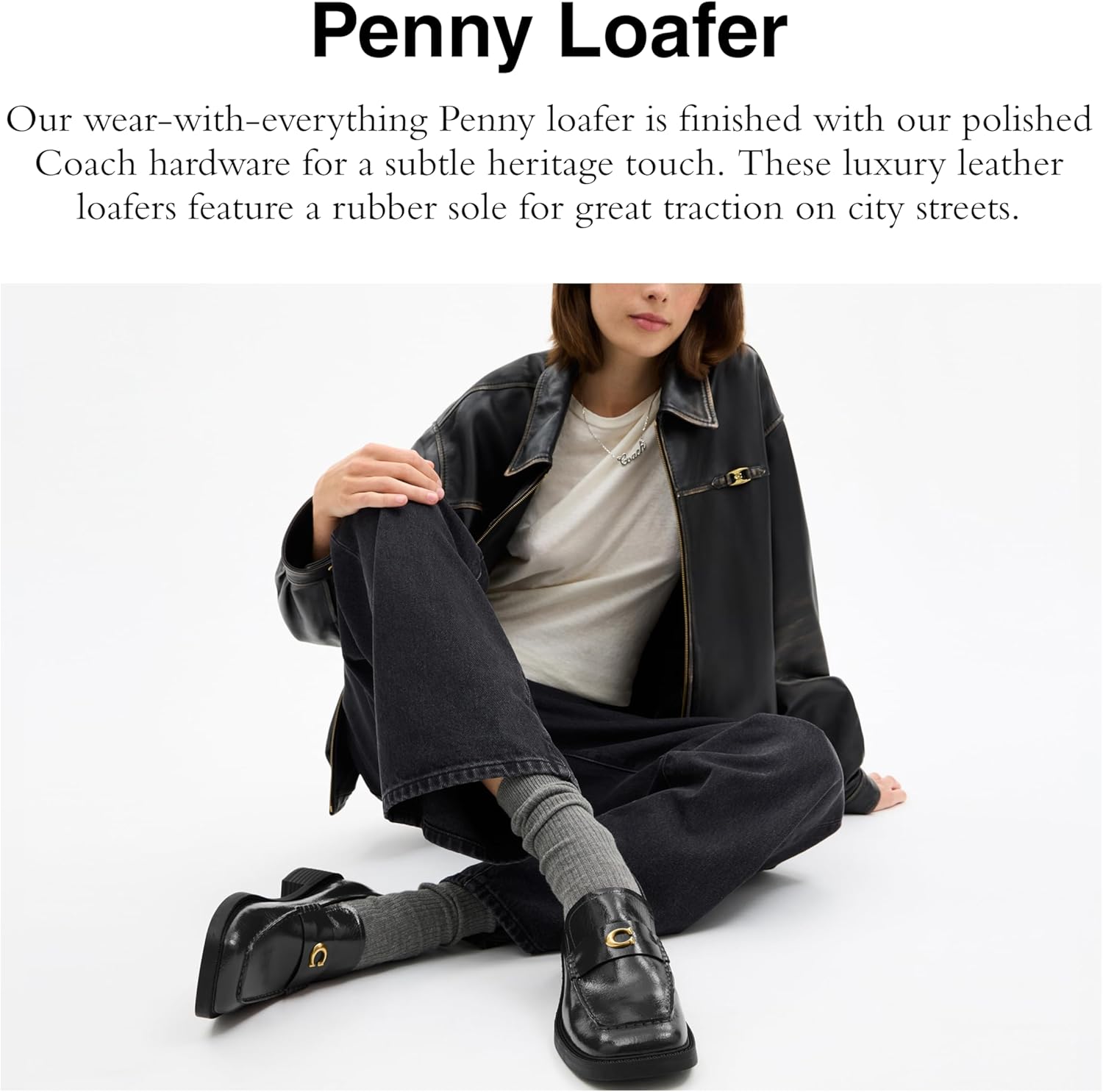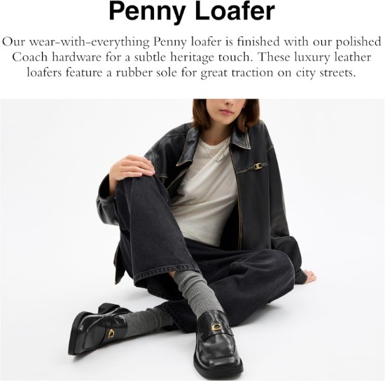 Our wear-with-everything Penny loafer features a glazed leather upper & is finished with our polished Coach hardware for a subtle heritage touch. These luxury leather loafers feature a 1' heel and a rubber sole for great traction on city streets.