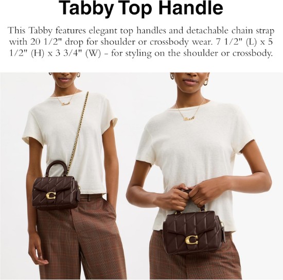 Hands down, this more petite version of our structured Tabby bag with a top handle adds a layer of sophistication. Crafted of smooth napa leather and finished pushlock closure for easy access and a chain strap to go hands free. Features one credit card slot, pushlock closure, leather lining, top handle with 2 3/4' drop, outside open pocket, detachable chain strap with 20 1/2' drop for shoulder or crossbody wear. 7 1/2' (L) x 5 1/2' (H) x 3 3/4' (W)