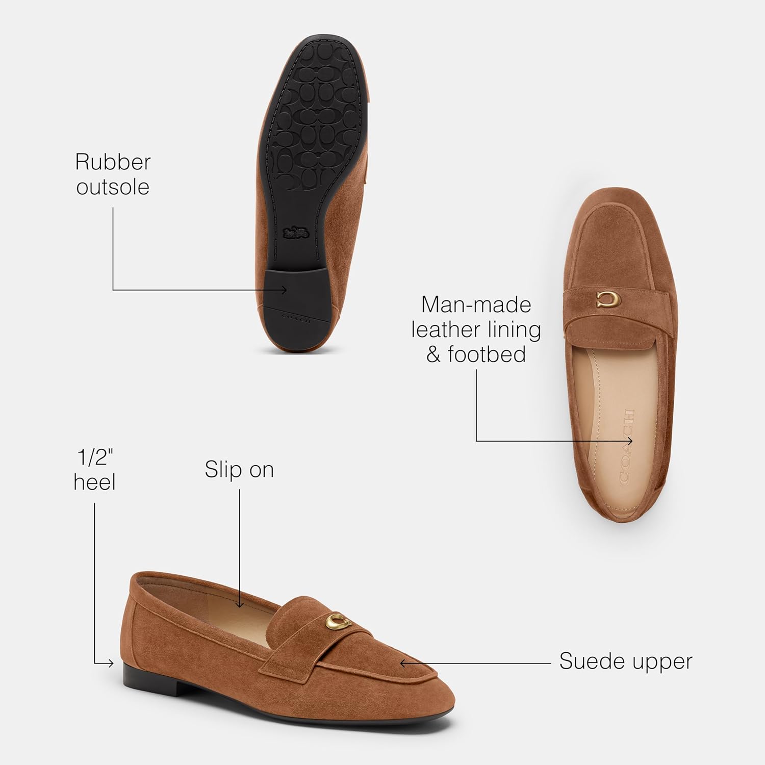 A timeless style that elevates any look, the Sculpted C Loafer is crafted of soft suede and is finished with our Signature C hardware for a heritage touch. Suede upper, man-made leather lining, leather footbed, rubber outsole, slip on, 1/2' heel