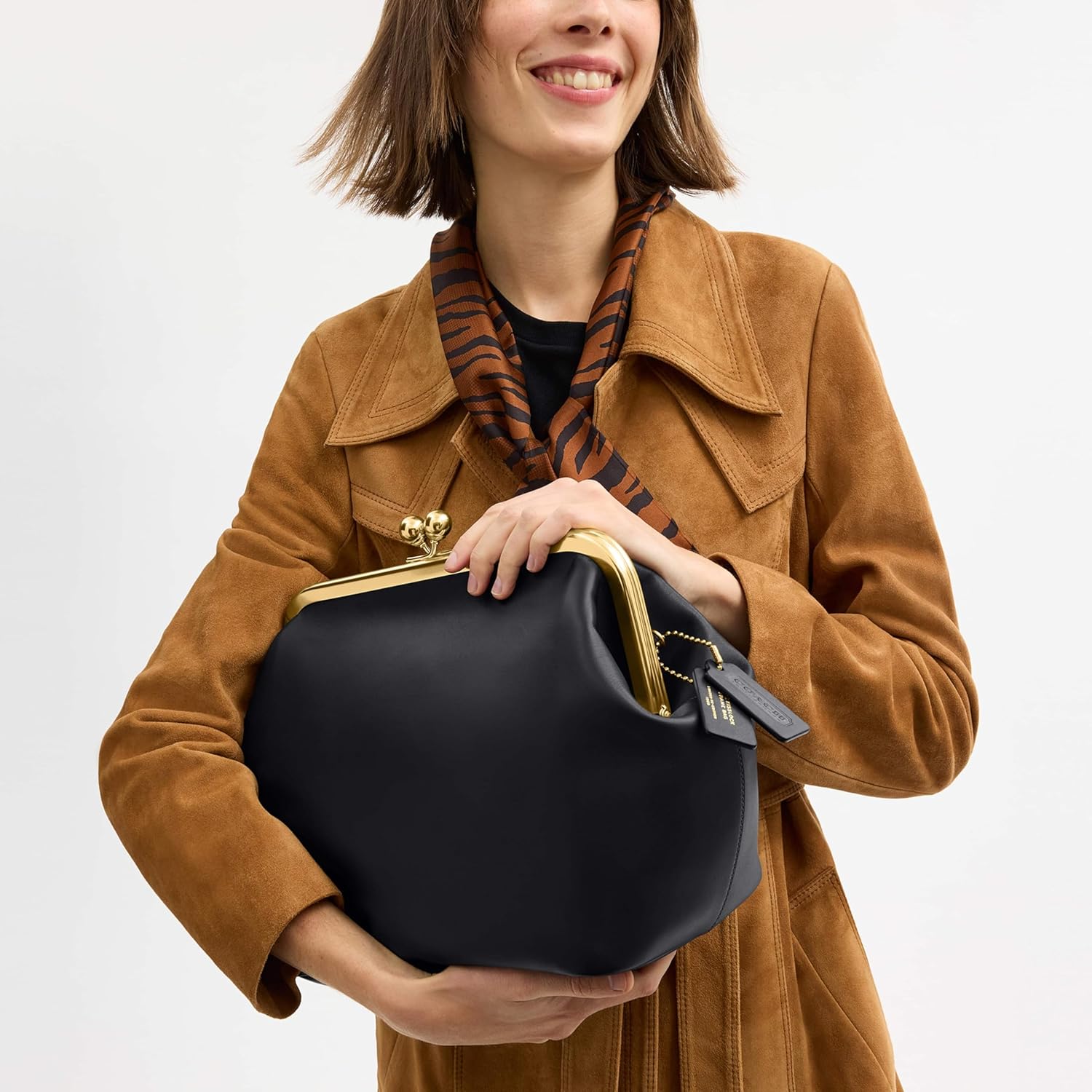 Perfectly classic with a 90s inspired kisslock closure, this charming and roomy frame bag is crafted of woven straw and refined calf leather for a sophisticated summer bag. Featuring one credit card slot, inside zip pocket, kisslock closure, regenerative cotton lining, detachable handle with 10 1/2' drop, 10 1/2' (L) x 9 3/4' (H) x 7 3/4' (W).