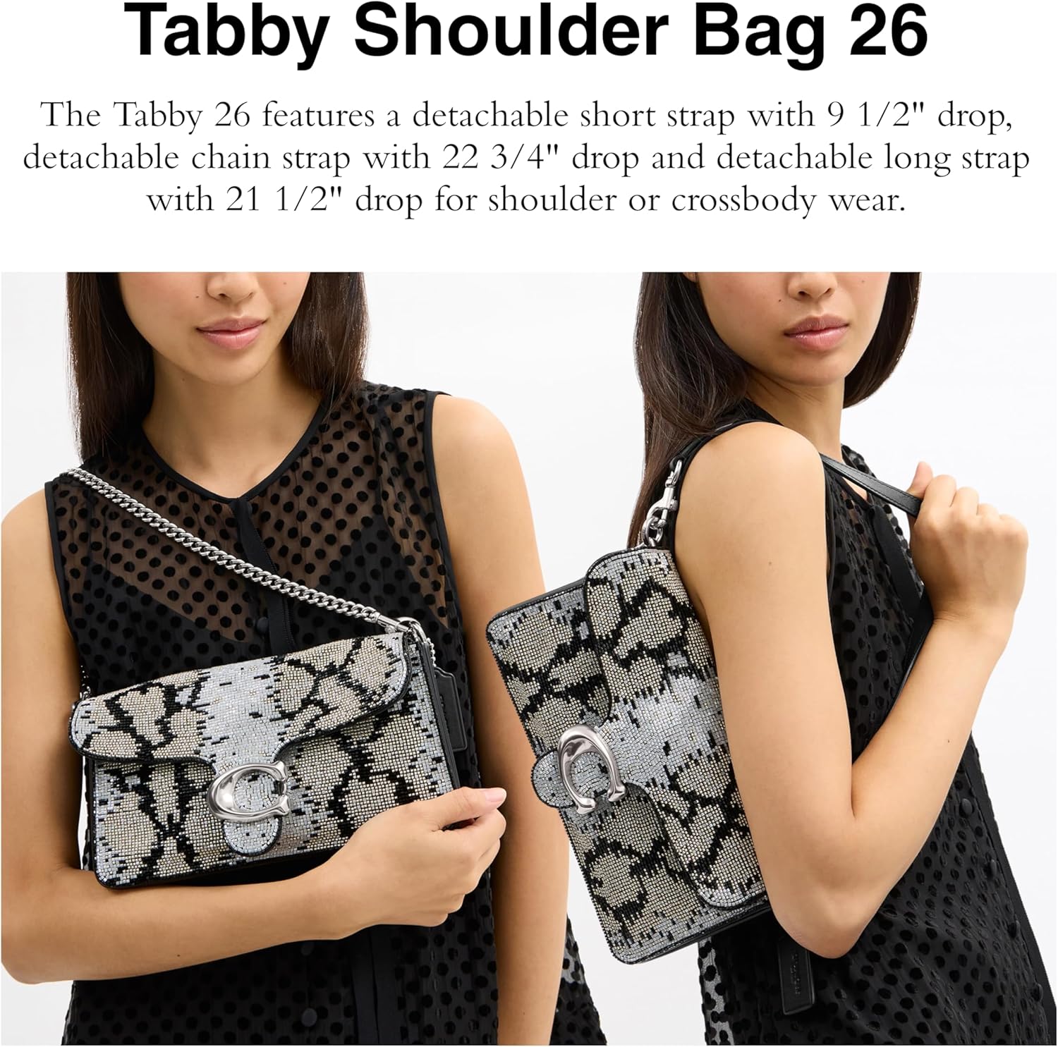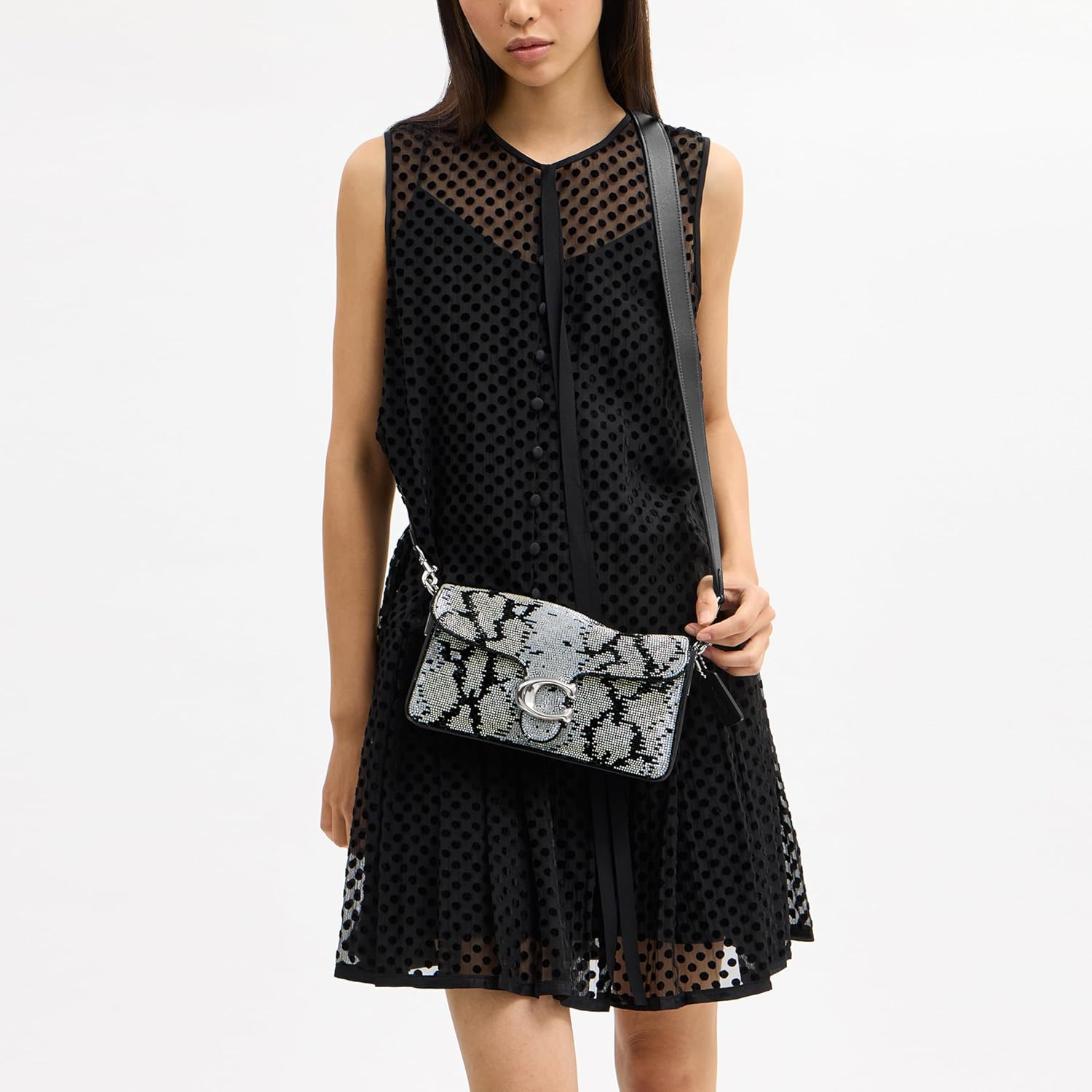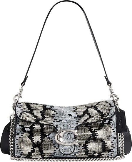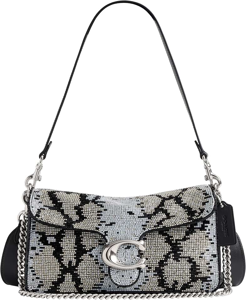 Editor's Notes: A modern take on an archival 1970s Coach design, this structured Coach Tabby bag makes a bold statement with its beaded snake pattern and signature C hardware – for a classic Coach bag