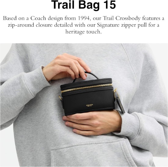 Based on a Coach design from 1994, our Trail Crossbody features a zip-around closure detailed with our Signature zipper pull for a heritage touch. Crafted of sophisticated glovetanned leather, this trail bag features a zip closure, fabric lining, top handle with 1 1/4' drop, detachable chain strap with 21 1/2' drop for shoulder or crossbody wear, 6' (L) x 3 1/2' (H) x 2 1/4' (W).