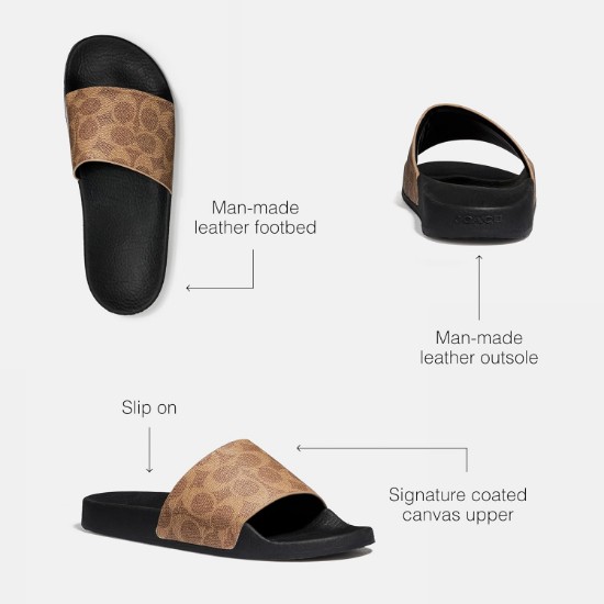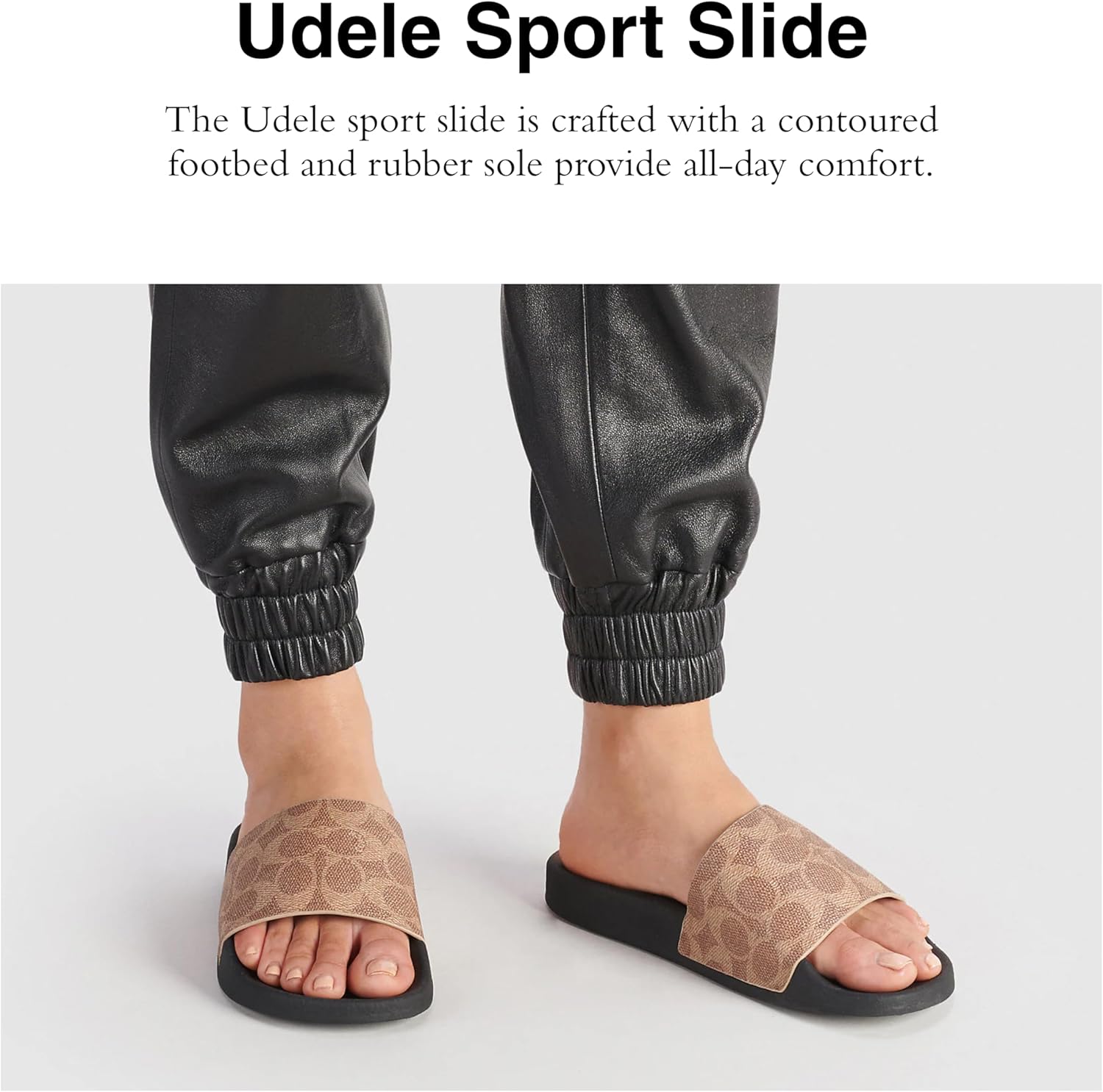 Simple never looked so stylish. These COACH Udele Sport Slide In Signature Canvas slide sandals combine a clean silhouette with a cushioned footbed for effortless comfort you'll reach for daily. These easygoing, sporty slides are made from a signature canvas upper for a classic look. It features a rounded open toe, a wide strap on the vamp with brand detailing, slip-on style, and low-top height. Faux leather lining and insole. Rubber outsole.