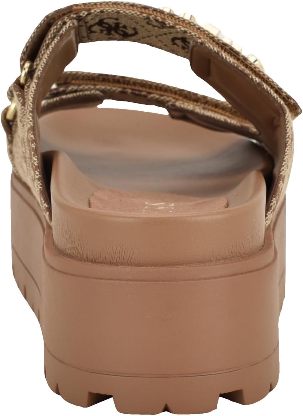 Embrace the sporty-chic trend with these versatile Guess platform slide sandals. Combining comfort with a bold, contemporary look, these slides are perfect for adding an edgy, elevated touch to your casual style. Featuring two wide, adjustable straps across the foot with a metal Guess logo detail.