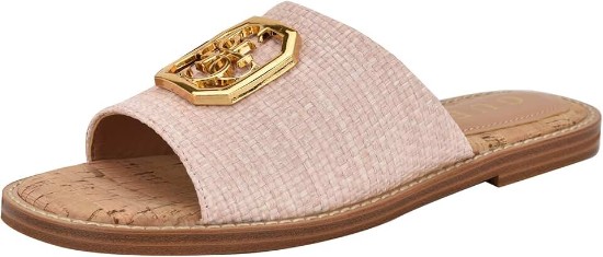 Step in style this season wearing the Graysie by Guess. This chic sandal highlights a cork footbed enhanced with woven upper material. The gold quattro G logo creates touches of hardware interest. Est. 1981, Guess is a global lifestyle brand and a symbol of a young, adventurous lifestyle.