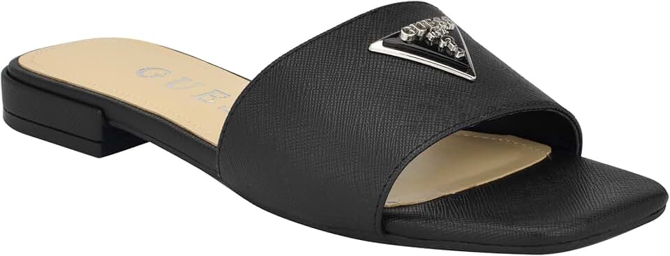 Adorned with a metal GUESS logo plate, this one band slide is your go to sandal of the season. Fashion forward colors and materials and a little block heel allow for style and comfort. Est. 1981, Guess is a global lifestyle brand and a symbol of a young, adventurous lifestyle.