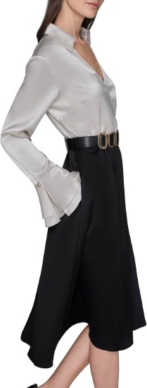 KARL LAGERFELD Women's Long Sleeve Crinkle Poly Satin Novelty Belt Midi Shirt Dress