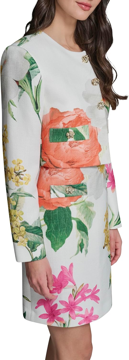This Karl Lagerfeld Paris Women's Cropped is a Solid Tweed Scoop Neck Flower Buttons Knit Blazer Jacket. DRESS SOLD SEPARATELY.