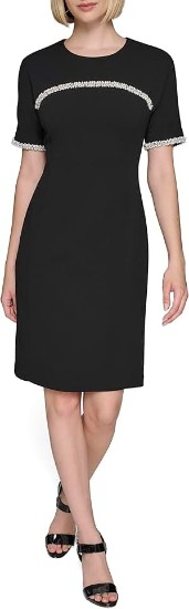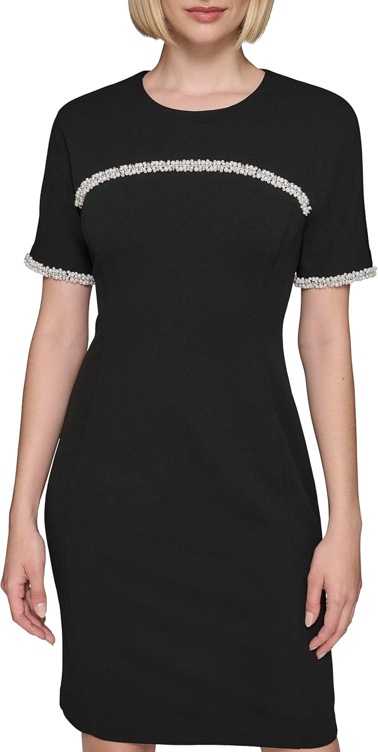 KARL LAGERFELD Women's Pearl Trim Short Sleeve Round Neck Sheath Dress