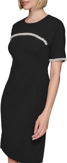 This Karl Lagerfeld Paris Women's Dresses sheath is a short sleeve round neck scuba crepe pearl trim short length