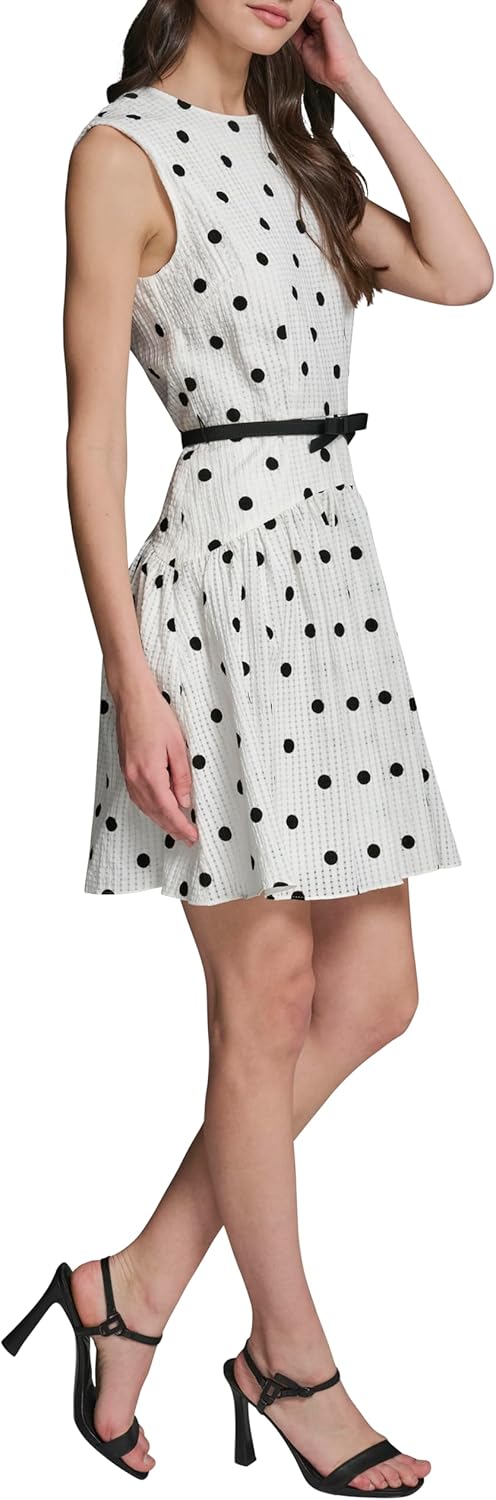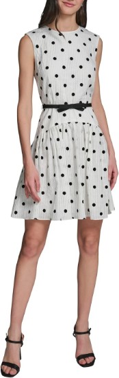 This Karl Lagerfeld Paris Women's Dress is a Short Sleeve Crew Neck Seersucker Belted A Line