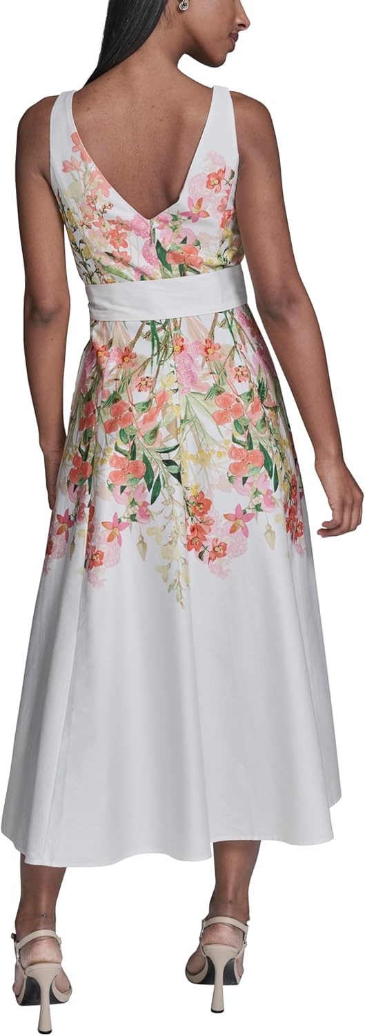 KARL LAGERFELD Women's Sleeveless V-Neck Cotton Sateen Midi Placement Floral Dress