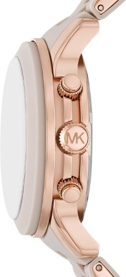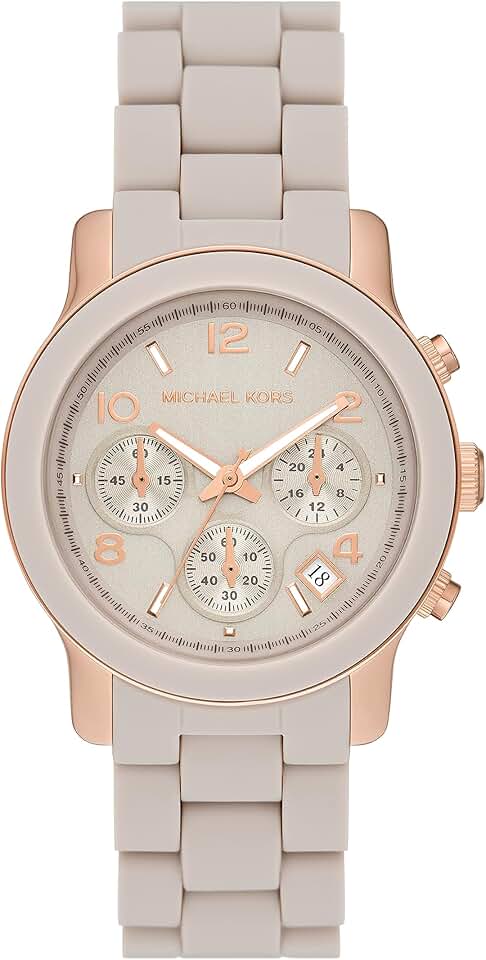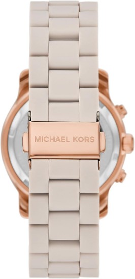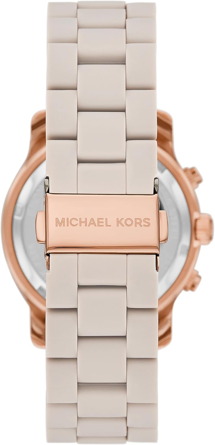 This Michael Kors Runway watch features a wheat brushed dial, chronograph movement and rose gold-tone stainless steel and wheat silicone strap.