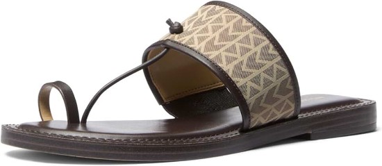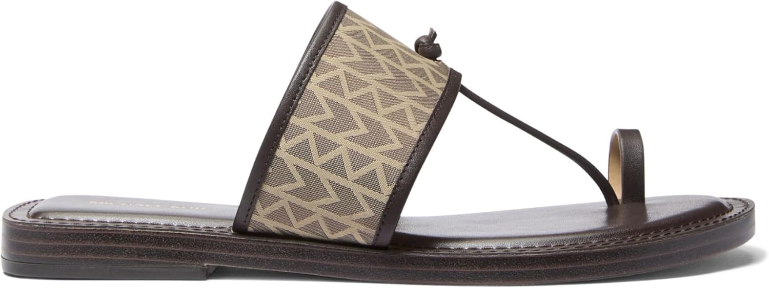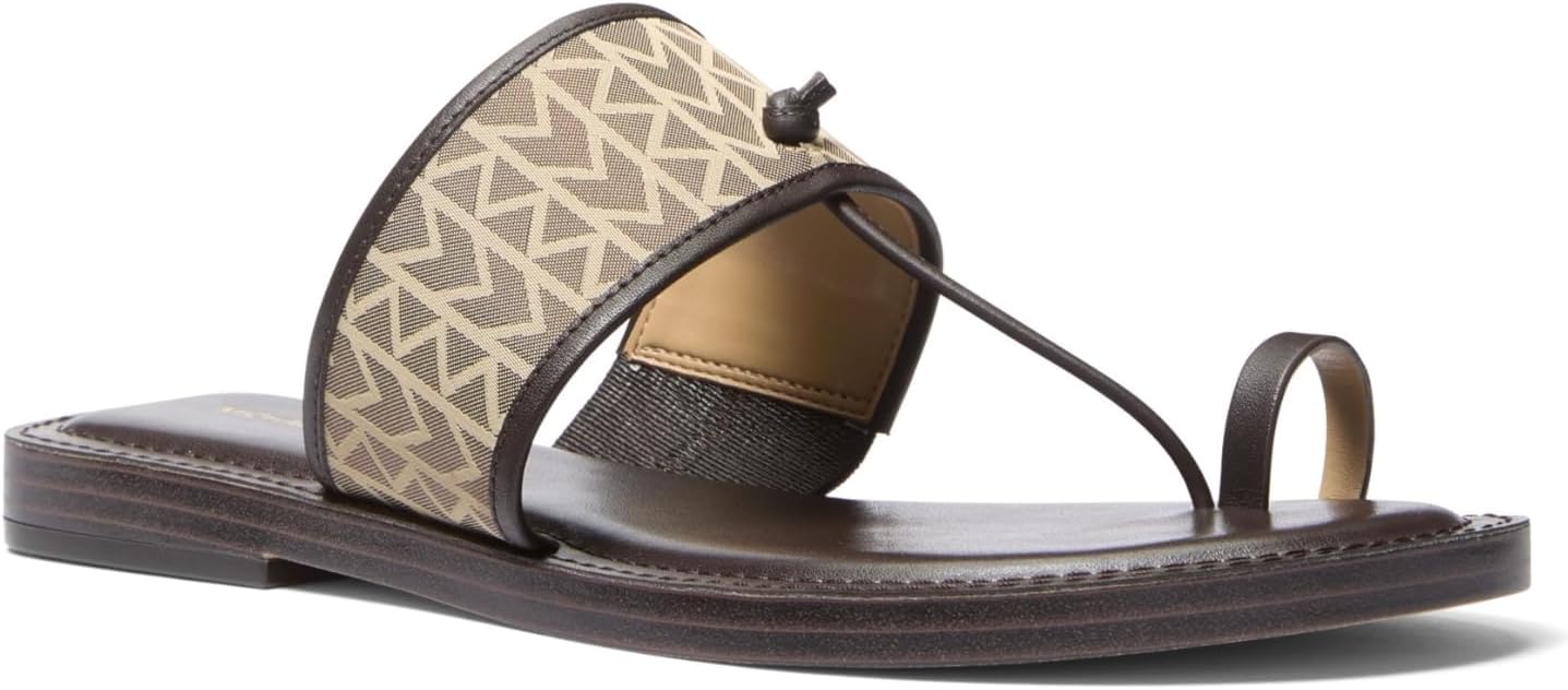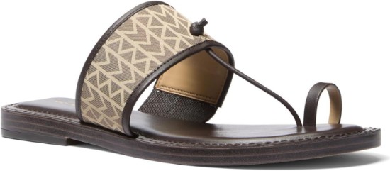 Slip-in and chill-out wearing the comfy MICHAEL Michael Kors Ashtin Sandals. Crafted from leather upper, polyurethane lining, and faux leather insole, this pair of sandals features open round toe, slip-on style, extra padded sock, signature jacquard