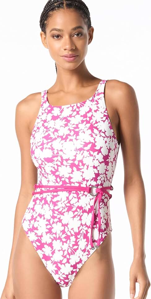Michael Kors Womens Monotone Floral Highneck Belted One Piece