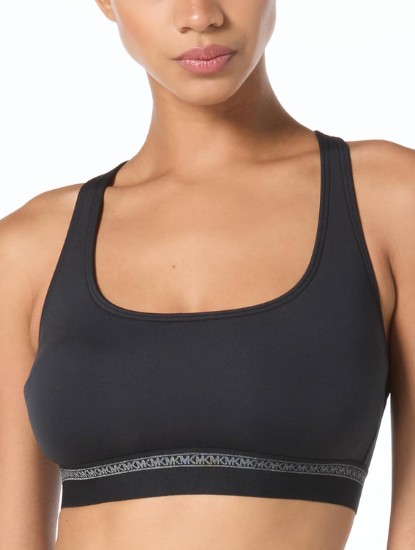 Swim, sport or sprint in this bra bikini top. Cross back straps lay comfortably. Logo elastic trim on a scuba fabric adds a splash of luxury.