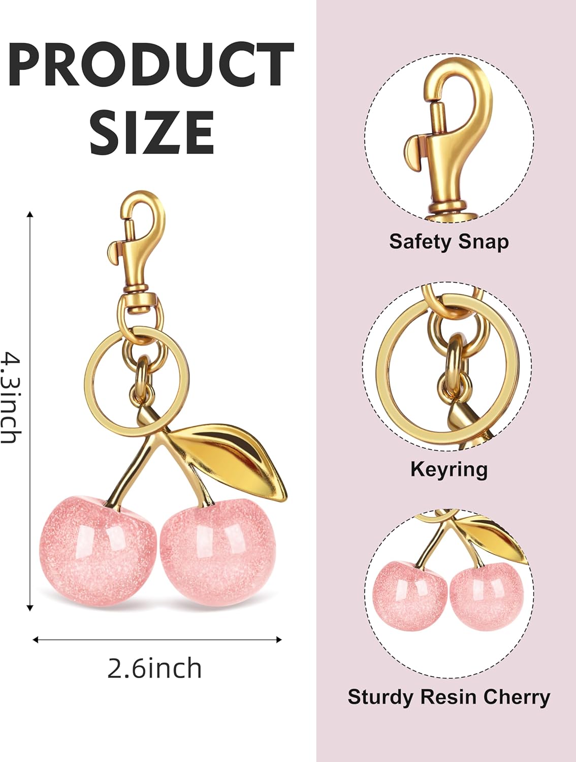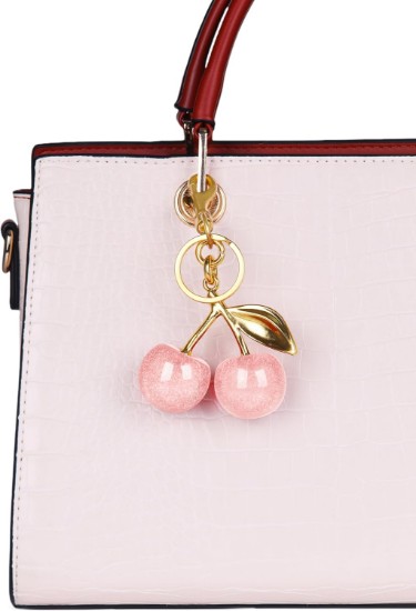 Bag Charm Material:Bag charm made of high quality sparkling resin, cherry keychain metal with the upper antique gold layer, purse charm lower part is a pair of high quality resin cherries Sparkling