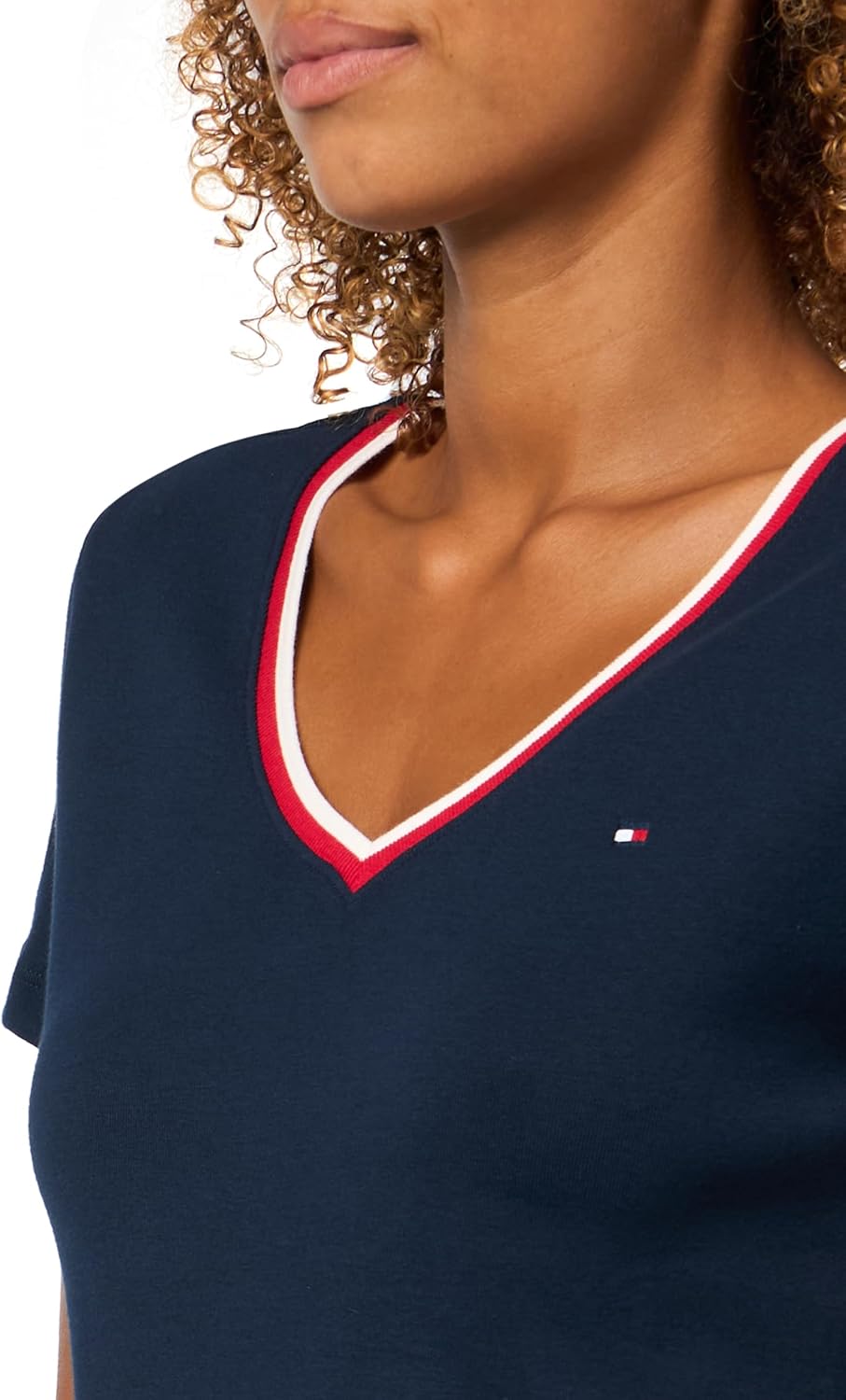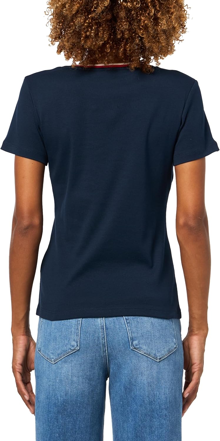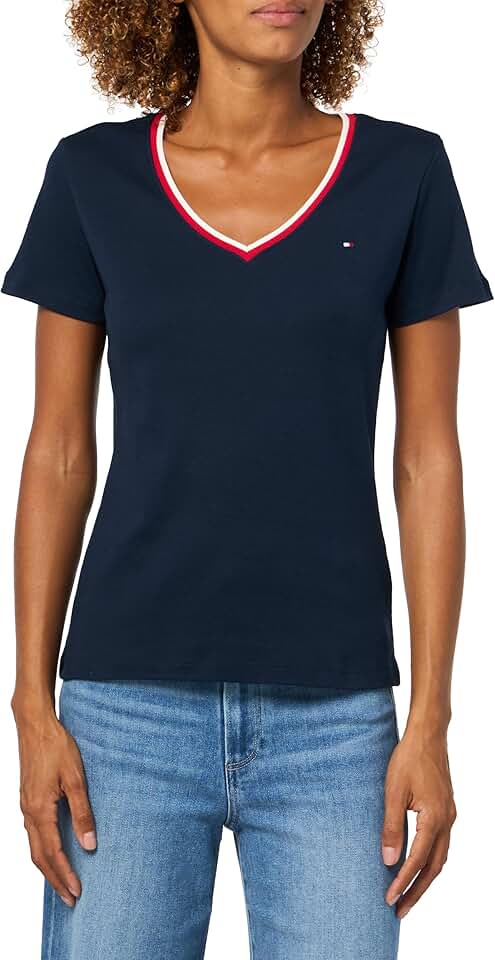 Introducing Tommy Hilfiger's iconic women's t-shirts, featuring the signature embroidered flag logo and crafted from premium 100% cotton for a soft hand feel and comfortable fit. These t-shirts for womens are the epitome of everyday style, perfect for effortlessly elevating your casual look. Durable enough to withstand serious wear, Tommy Hilfiger's t-shirts for women are breathable, crisp, and lightweight, ensuring you stay cool and comfortable every time you slip them on. The special wash process gives these V-neck t-shirts their softness, making them a solid basic option for any wardrobe. Pair them seamlessly with your favorite Tommy Hilfiger shorts, pants, jeans, or jackets for versatile styling options suitable for any occasion, whether it's a casual outing or a formal event. Ideal for daily wear, work, school, events, vacation, or special occasions, these women's shirts are a wardrobe essential. Treat yourself or surprise a loved one with this timeless piece, perfect for mothers, sisters, girlfriends, wives, daughters, or friends. Elevate your everyday style with the unbeatable quality and sophistication of Tommy Hilfiger's women's shirts.