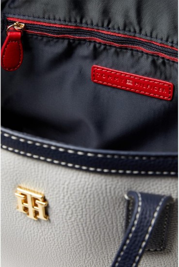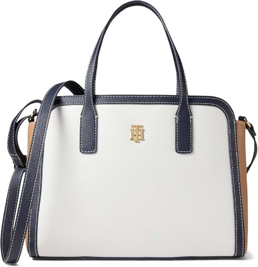 Tommy Hilfiger Liv II Convertible Satchel Color-Block Pebble PVC White Greige/Basket Brown/Tommy Navy One Size