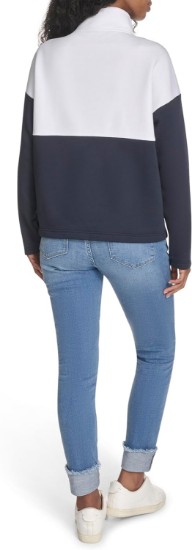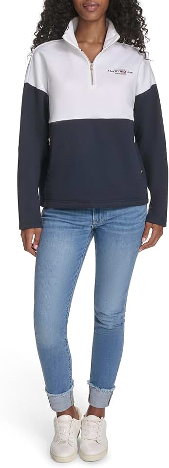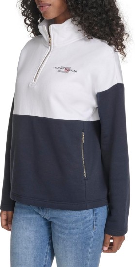 This Tommy Hilfiger Women's Sportswear 1/4 Zip Mockneck Fleece Sweatshirt is a 1/4 zip mockneck colorblock fleece sweatshirt
