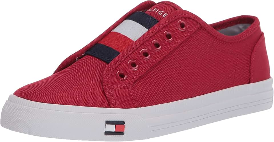 Tommy Hilfiger women's sneaker. Our latest take on the iconic sneaker comes to you sans laces, accented with iconic Hilfiger flag colors of red, white and blue (plus a cushioned insole for added comfort).