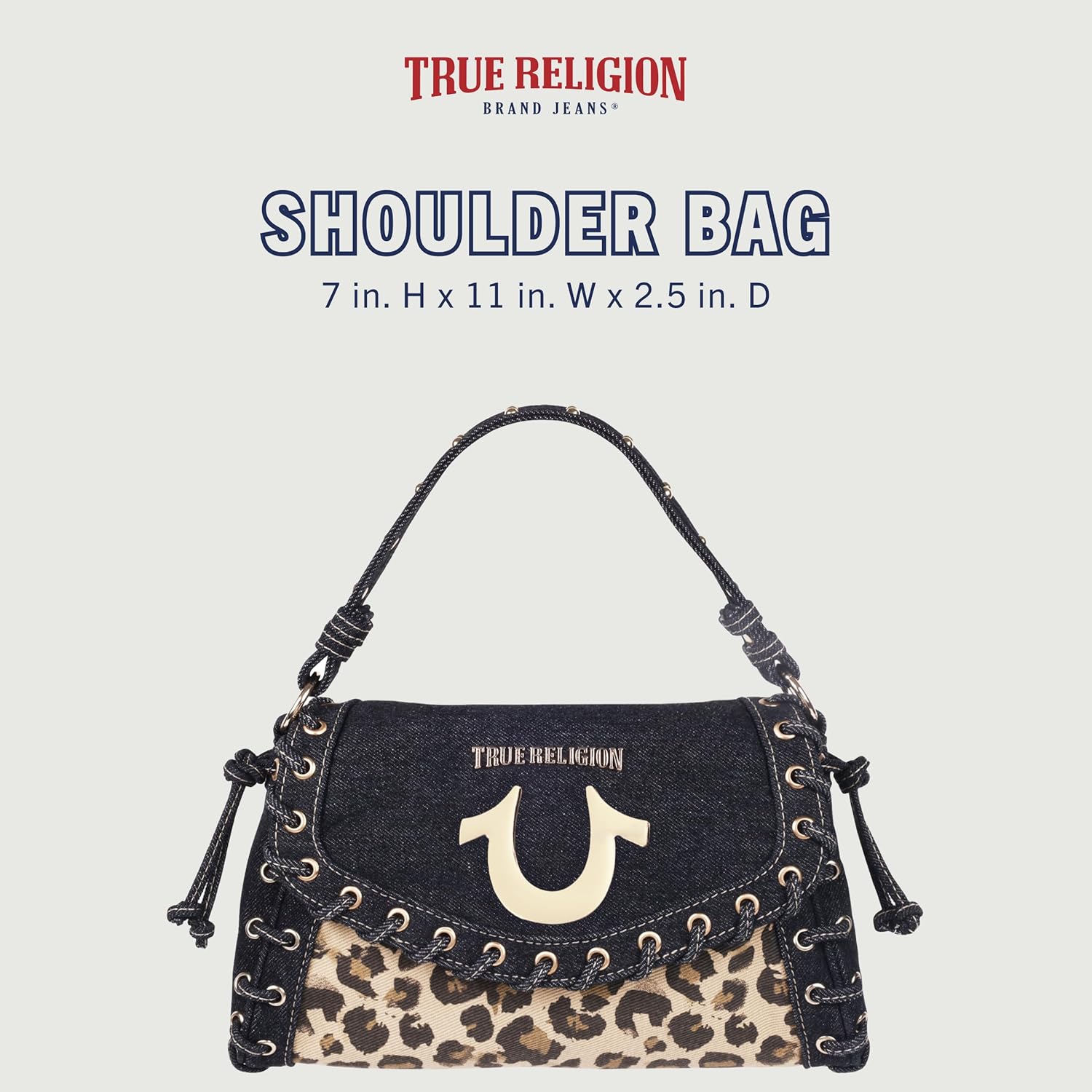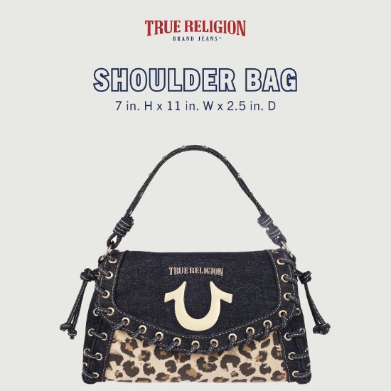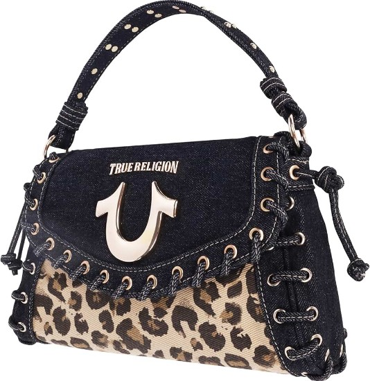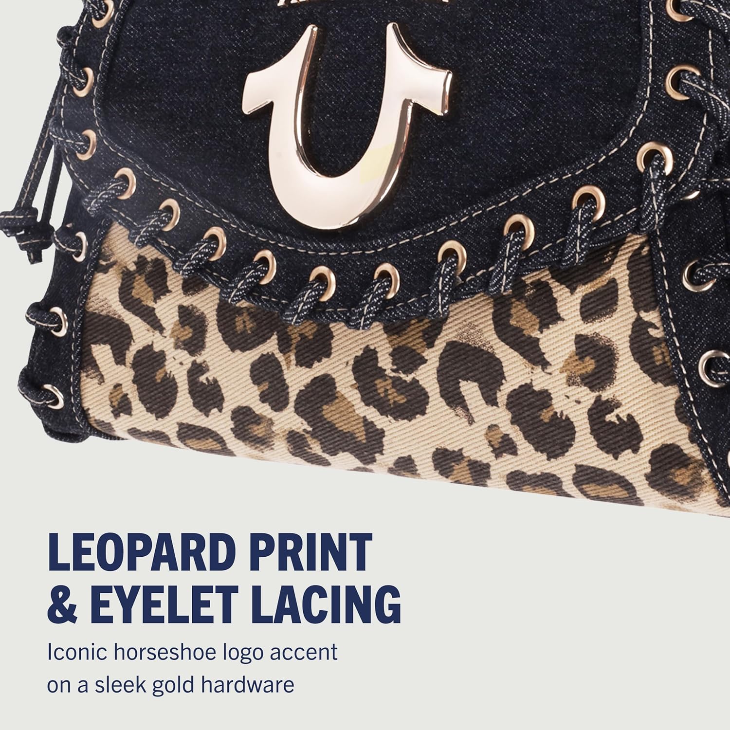 True Religion Denim Eyelet Trim Flap Bag, Studded Lace-Up Crossbody Shoulder Handbag with Horseshoe Logo, Leopard