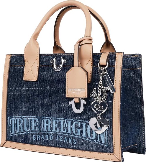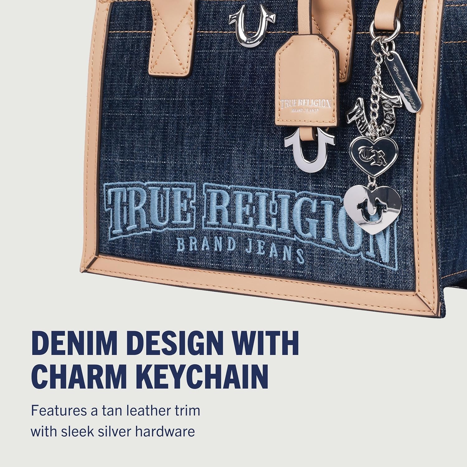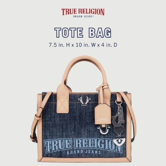 Classic denim gets an edgy upgrade in the True Religion Bombe Logo Denim Tote—a structured carryall that merges brand heritage with statement-making detail. Designed with contrast tan trim and an oversized bombe-style embroidered logo, this bag makes a strong impression from street to studio. The dual-handle design is complemented by a removable crossbody strap for flexible styling, while silver hardware, horseshoe emblem, and logo charm keychain add eye-catching finish. The interior is fully lined with the brand’s signature horseshoe-print polyester and features a back-wall zip pocket to keep your essentials organized and secure. The compact silhouette holds just enough without feeling bulky, making it ideal for everything from brunch plans to afternoon errands. This tote offers everyday function in a fresh denim look that pairs effortlessly with any modern wardrobe.