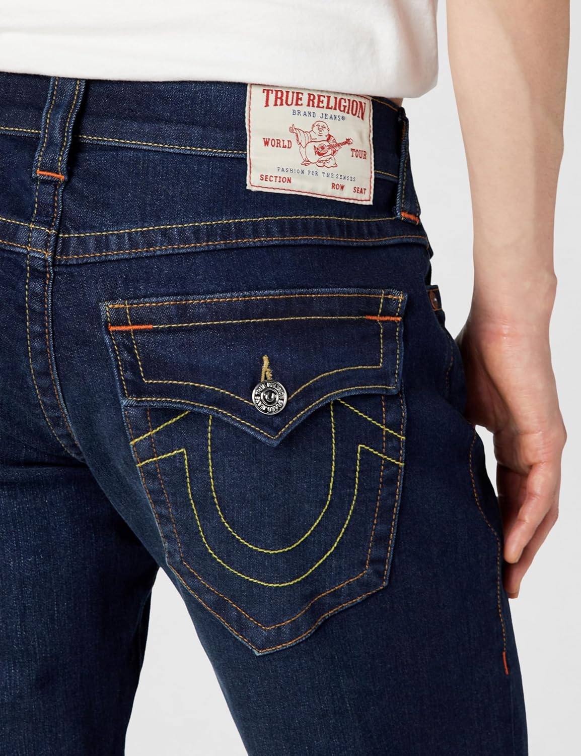 The True Religion Men’s Ricky Straight Leg Jeans with Back Flap Pockets are a timeless staple in mens jeans, combining comfort, durability, and signature style. Featuring a 32' inseam, 14' leg opening, and straight-leg silhouette, they provide a great fit that’s true to size. Crafted from a premium fabric blend of 95% cotton, 3% Elasterell-P, and 2% elastane, these jeans deliver softness, structure, and just the right amount of stretch for everyday comfort. Built with five-pocket styling, zipper fly, and button closure, they are designed for long-lasting wear. The iconic back flap pockets with True Religion’s horseshoe embroidery set them apart from typical regular fit mens jeans, adding distinctive character. Whether you’re after versatile jeans for men that pair with sneakers or polished blue jeans for men to wear with boots, the Ricky Straight Leg is a must-have. Available in multiple washes and all sizes.