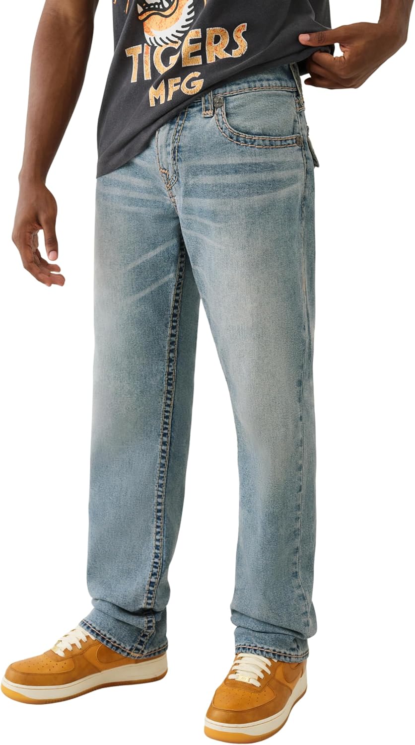 True Religion Ricky Super T Flap Jeans, the ultimate blend of rugged style and signature craftsmanship. These jeans feature a straight-leg fit, bold Super T contrast stitching, and flap back pockets with True Religion’s iconic horseshoe embroidery. Designed for comfort and impact, the premium stretch denim construction ensures all-day wearability while maintaining a standout look. Whether you're going casual or aiming for a streetwear edge, these jeans deliver.Attributes: Brand: True Religion Style Name: Ricky Super T Flap Fit: Straight Leg Inseam: Typically 32–34 inches Rise: Mid Rise Closure: Zip fly with branded button Back Pockets: Flap pockets with horseshoe embroidery Details: Super T oversized contrast stitching, logo hardware Style Type: Streetwear / Premium Denim / Casual Care Instructions: Machine washable